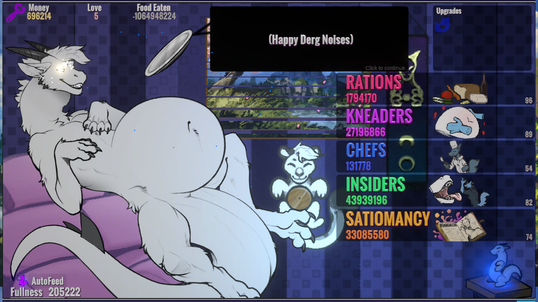 Also because I couldn't help myself I kept playing the game until I could replicate HelioDragon's bug, (I actually went negative for amount fed and back to positive and I just stopped being able to keep them full after an upgrade + not earning money) so I consider the game beaten now :3